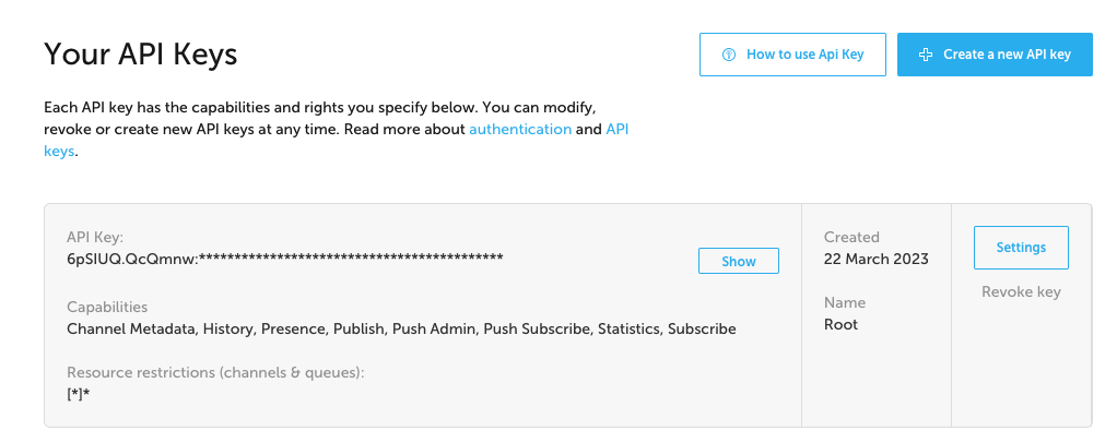 There are multiple keys on the same account because you can configure each key to have different permissions on your Ably channel (Remember, realtime APIs allow publishing and subscribing to the same channel?). You want the root key on the backend of your application.