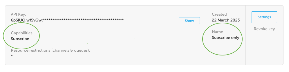 And you want the subscribe-only key on the frontend. We'll be adding it to the poll.service.ts and the main.js. You can see the permissions for the key clearly labeled on the left under "capabilities" and on the right under "Name".